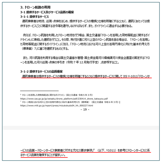 本制度は、国が推進する「デジタルライフライン全国総合整備計画」に基づき策定された『ドローン航路運航ガイドライン(経済産業省・IPA DADC)』 においても、下記のように明記されており、JIS Y1011の活用が推奨されています。